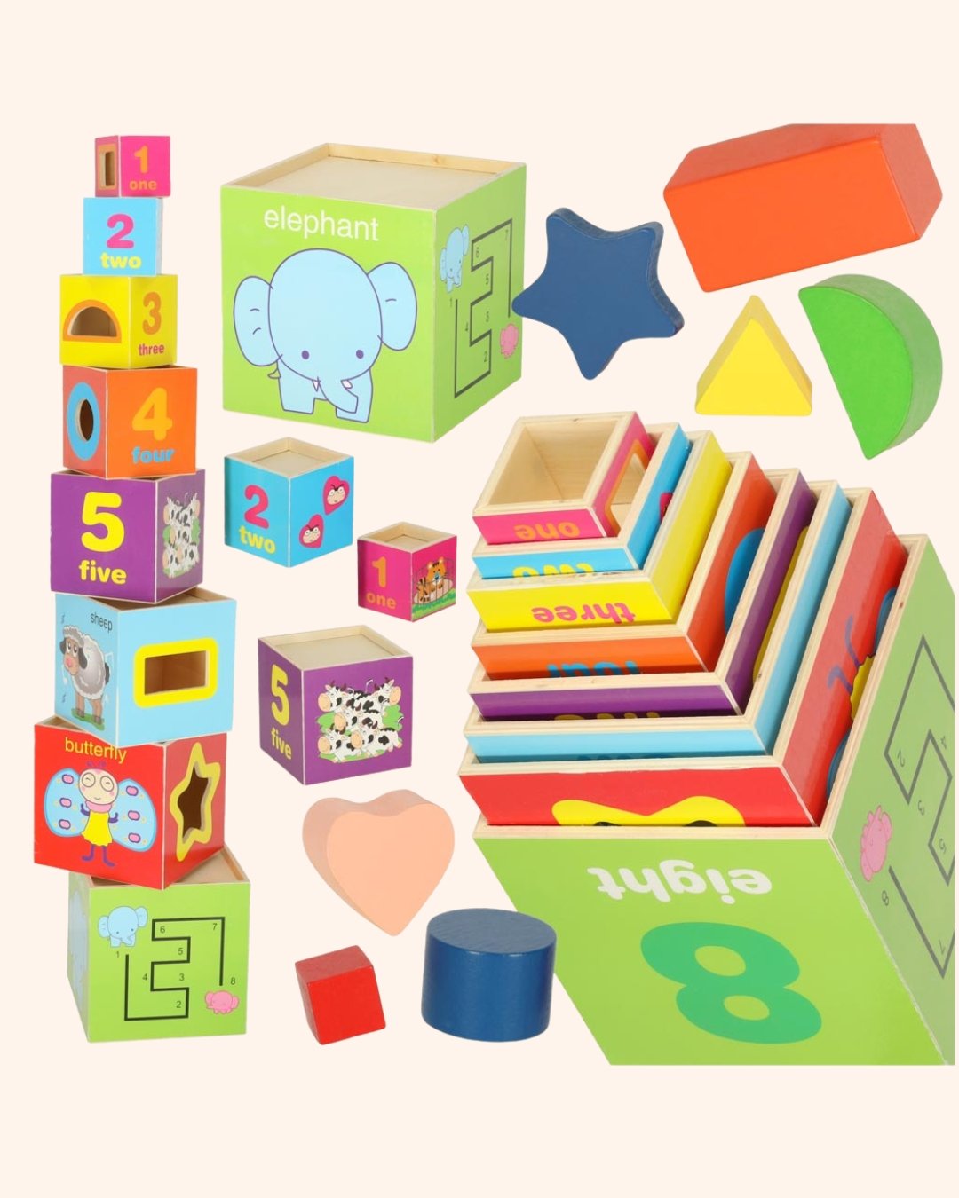 Rinkinį sudaro medinė piramidė XXL ir spalvingos kaladėlės su skirtingais formų išpjovimais. Kiekviena figūrėlė telpa tik į jai skirtą angą, todėl vaikas mokosi atpažinti ir rūšiuoti, tuo pačiu stiprindamas smulkiąją motoriką.